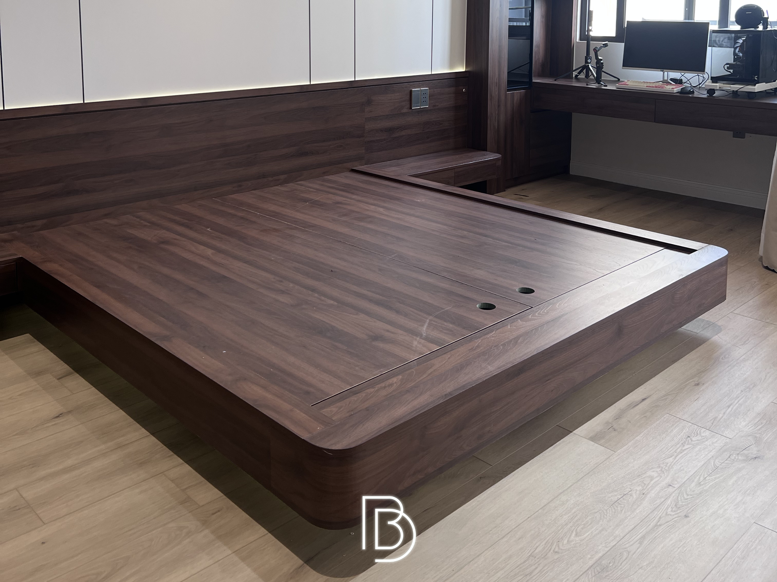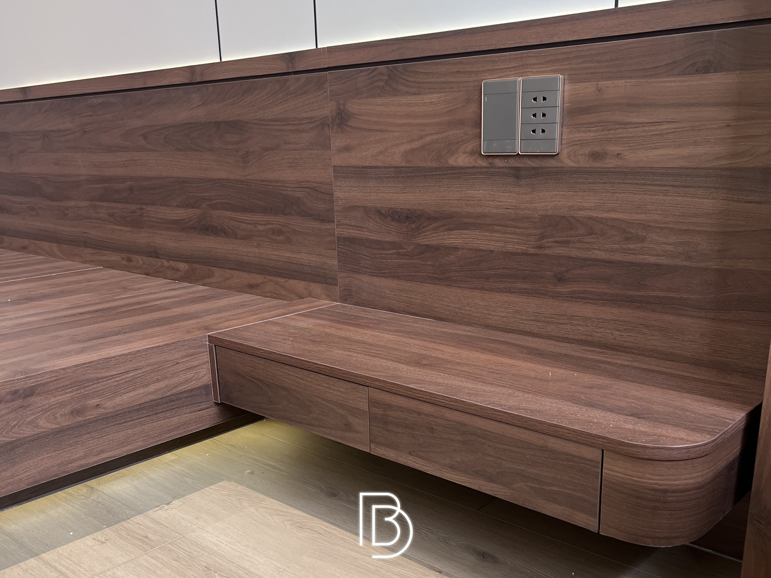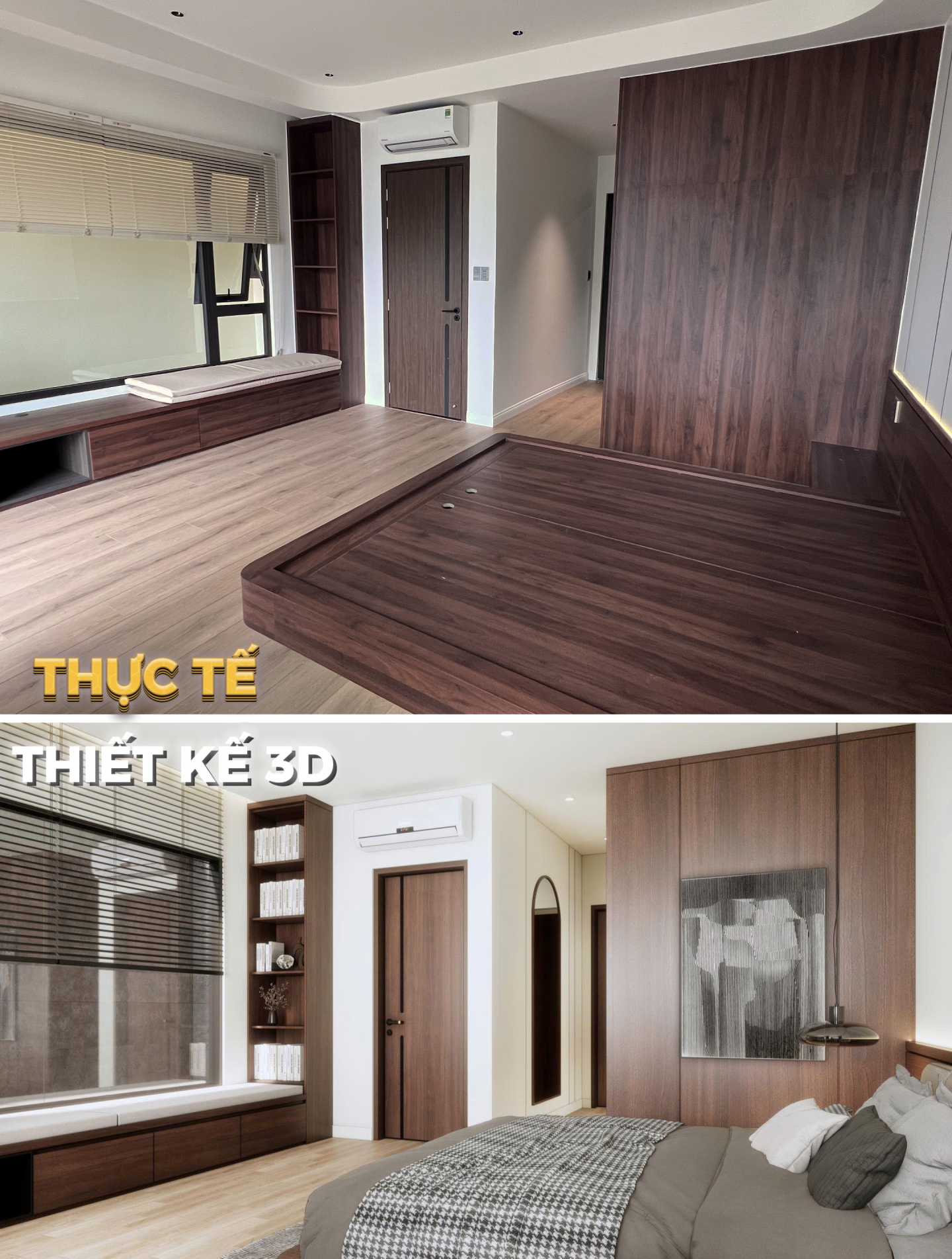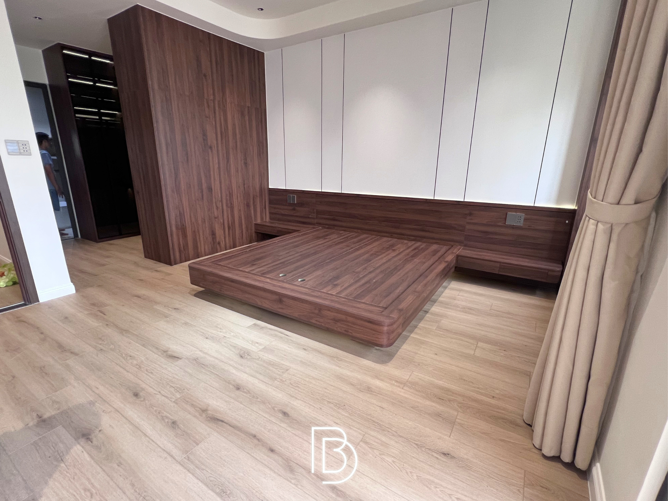 Nghệ thuật ốp vách đầu giường: Đây là khu vực tiêu tốn nhiều tâm huyết nhất của đội ngũ thi công. Sự hòa quyện giữa vải nỉ bọc da êm ái, gỗ vân óc chó sang trọng và ánh sáng vàng từ đèn thả tạo nên một không gian đậm chất Luxury. Những chi tiết bo góc mềm mại không chỉ an toàn mà còn mang lại cảm giác dễ chịu, thư thái tuyệt đối.