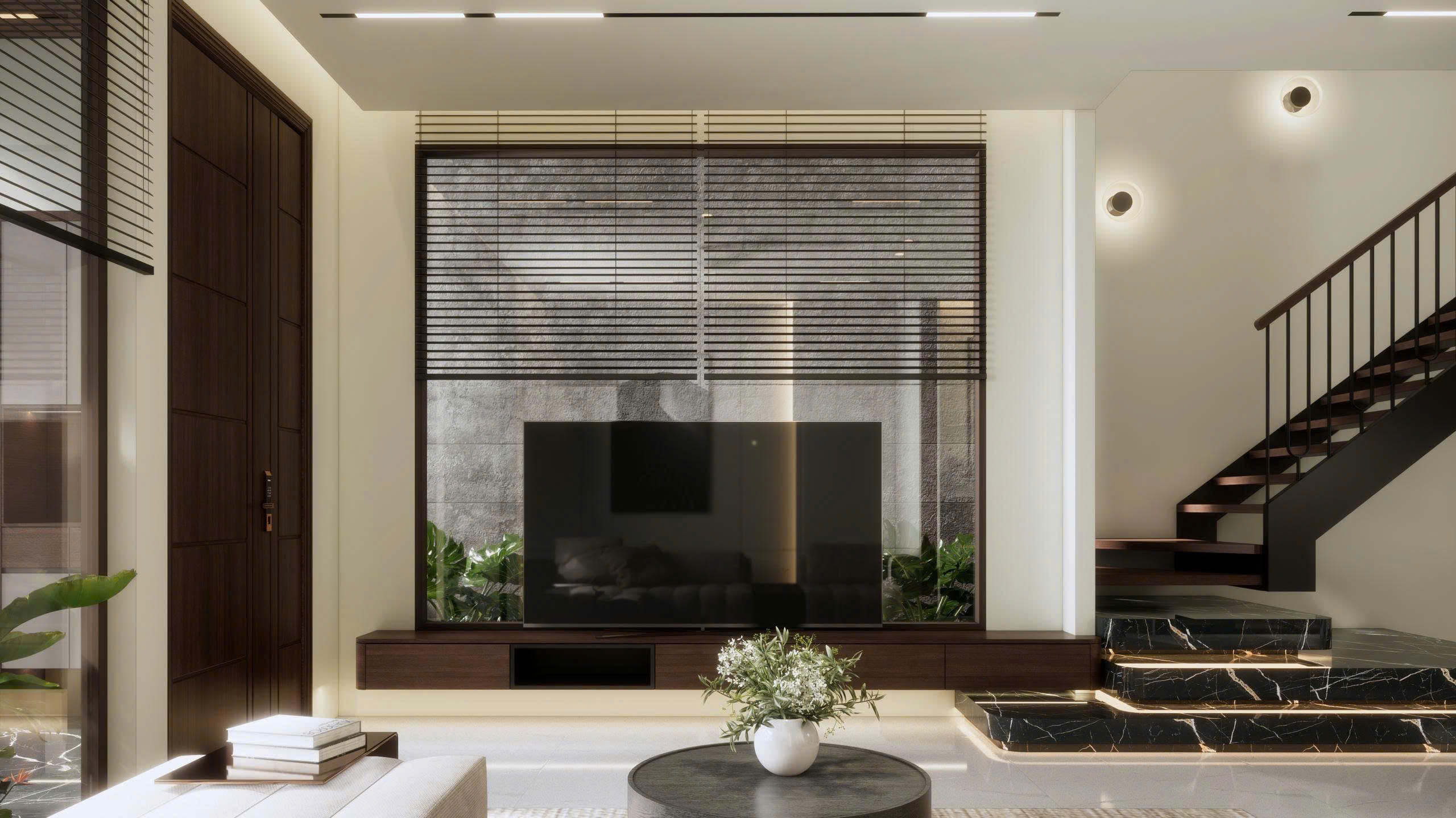 Hệ thống cầu thang hiện đại: Một chi tiết không thể bỏ qua là khu vực cầu thang với các bậc đá đen vân trắng được thi công LED hắt dưới mỗi bậc. Đây không chỉ là lối đi, mà còn là một “tác phẩm ánh sáng” giúp không gian trở nên lung linh hơn vào ban đêm.